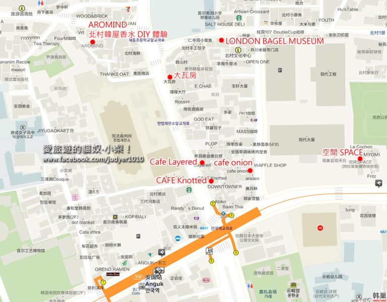 空間SPACE的位置,標示如下,距離地鐵3號線安國站(328)3號出口很近,附近也有好多我之前介紹過的,超有名的咖啡廳及北村韓屋香水DIY體驗,大家可以一併安排哦!