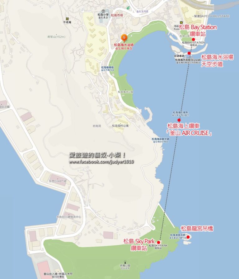 這是現在所有松島景點的位置地圖,包含:松島海水浴場天空步道(簡稱:松島天空步道)、松島海上纜車、松島龍宮吊橋