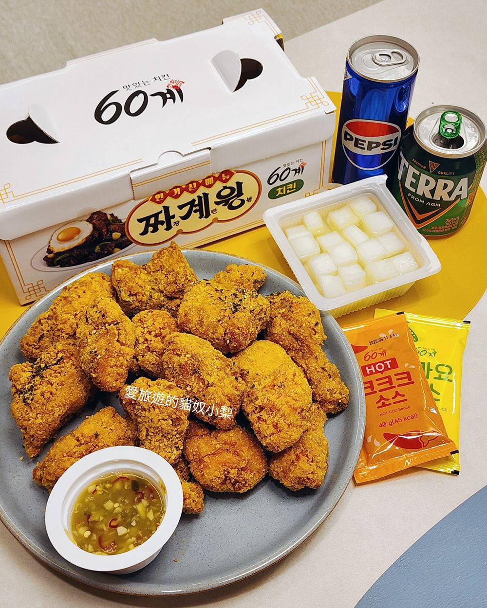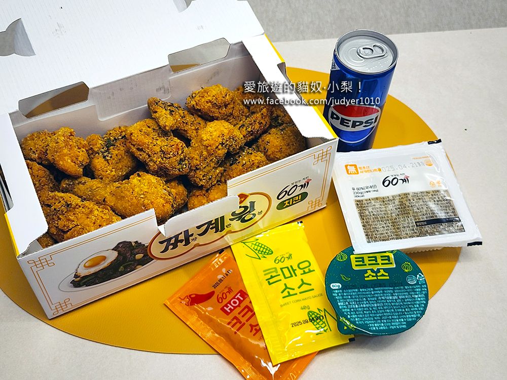 60雞炸雞60계치킨現在是我心中第一名的韓國炸雞啦!我們是在2025/3月釜山自由行時,經由我的釜山好友金大哥的老婆就是金大嫂的強力推薦才吃到的,一吃真的驚為天人啊!金大嫂說「60雞炸雞」主打他們炸雞的油,都是使用最新鮮的油,一天只炸60隻炸雞,當天沒用完的油就會廢棄處理掉,絕不會用隔夜油,然後我們吃的是超人氣『CCC Chicken 크크크 치킨』口味,是結合了Crumble、Crunchy、Crispy三重酥脆的炸雞最佳口感,這一款也是BTS田柾國在2023年初的深夜直播中吃的!另外,還會附上汽水、醃蘿蔔及3種沾醬,包含:辣醬、玉米醬、醬油蒜香醬,無論是單吃或配著沾醬吃,都好吃到爆炸,一整個完勝橋村炸雞!大推給大家哦!