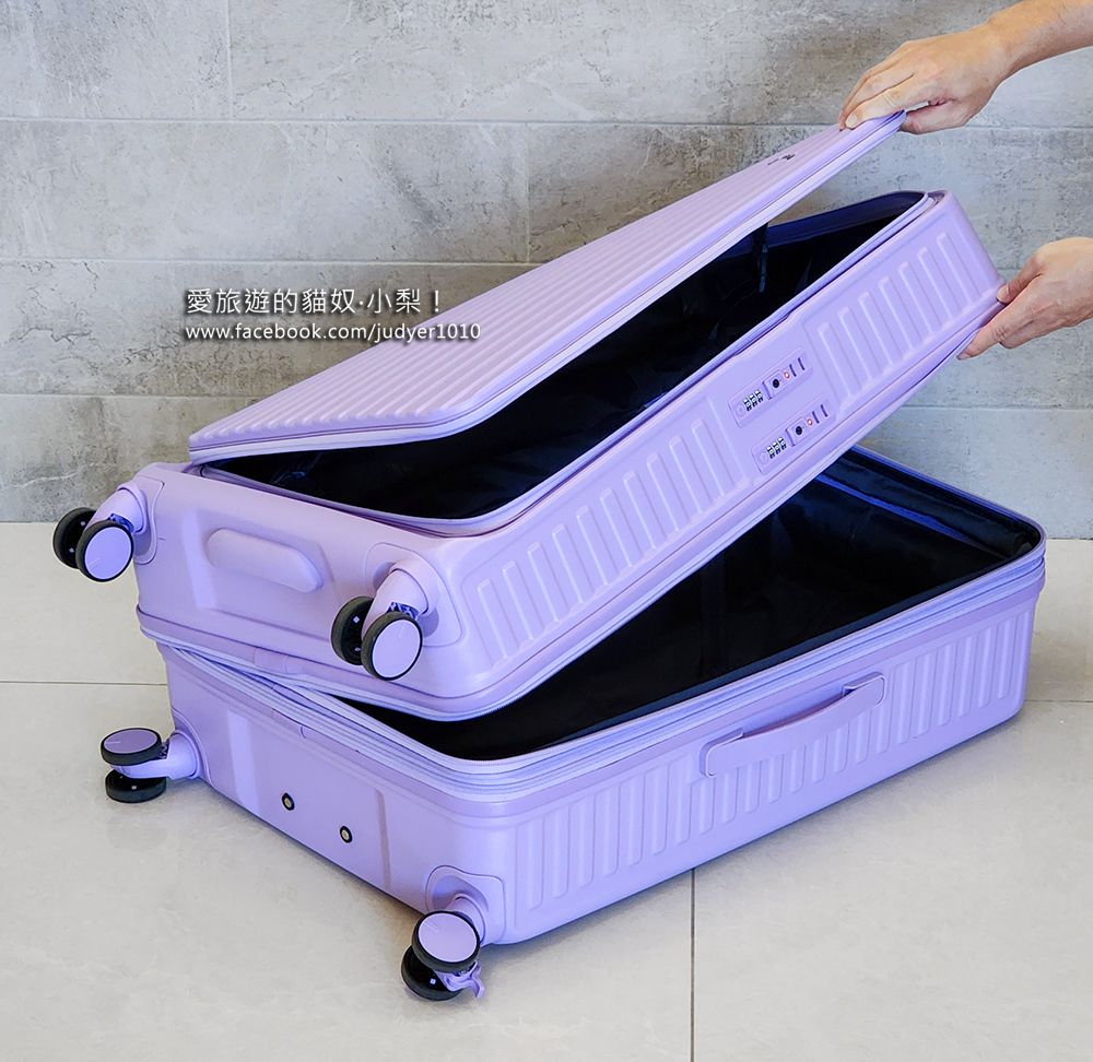 如下圖,先來看『5:5對開』長這樣,內容量就跟河馬箱1.0極致美學防爆拉鍊行李箱差不多~而中間的內部拉鍊隔層,可以捲起收納~~~在使用上更靈活便利!!!