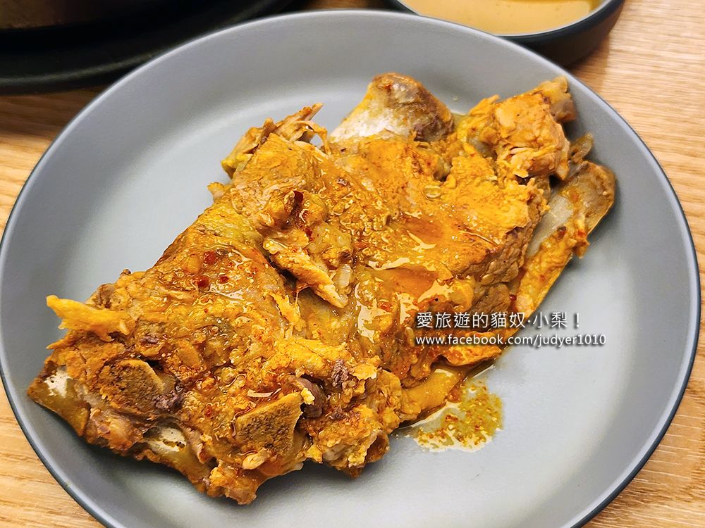 說明一下,大部分的一人份豬骨醒酒湯裡面沒有馬鈴薯,如下圖~如果要吃馬鈴薯,就要點有分大、中、小的一鍋的"감자탕馬鈴薯排骨湯",另外,排骨肉搭配下圖右下角的黃芥末沾醬一整個大加分~~~讚讚讚