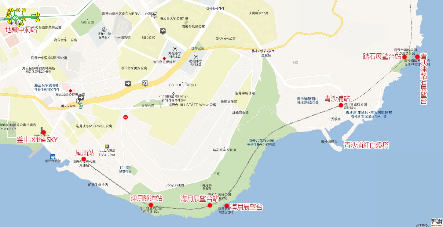 釜山的天空步道真的超多的有:松島天空步道(松島雲端散步路)、五六島天空步道、青沙浦踏石天空步道、影島天空步道、松島龍宮雲橋,以及2024年7月底開放的這一篇介紹的海月天空步道。海月展望台해월전망대(海月天空步道)的位置標示如下,它位於海雲台藍線公園 尾浦站與青沙浦站的中間,只要沿著海岸列車鐵道旁的木棧道走約一公里即可看到啦!