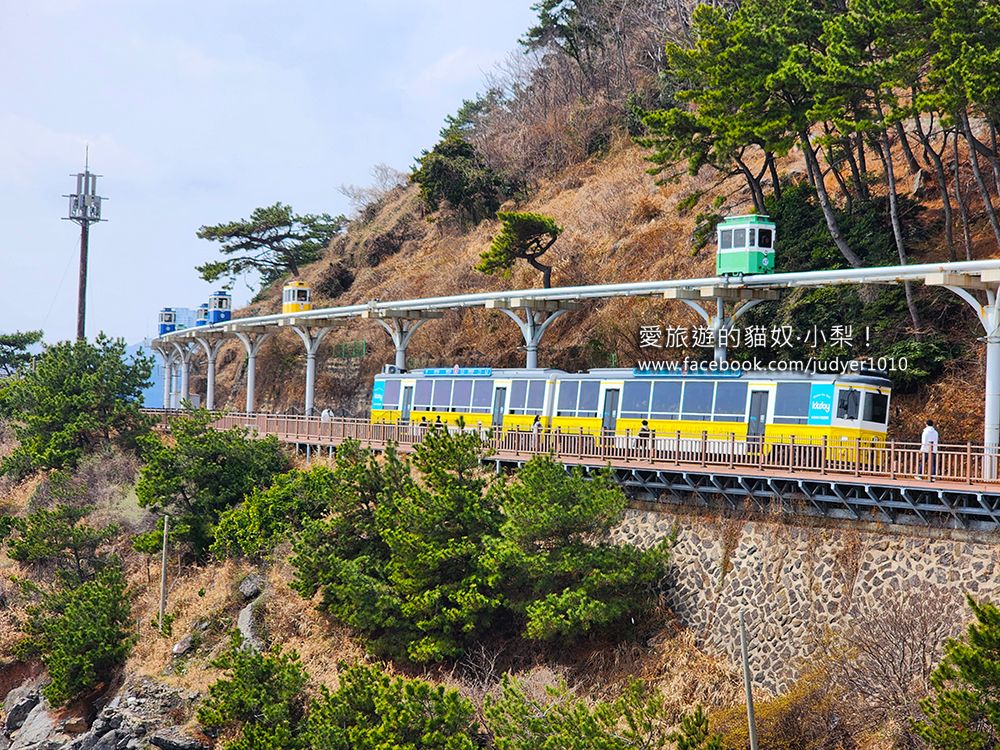- 我們在2025/3月釜山自由行,是先搭乘天空膠囊列車從尾浦出發到青沙浦,下車之後,再從青沙浦往回走 (尾浦的方向) 一路慢慢散步步行海邊的木棧道,就會經過海月展望台了,拍完照再走回尾浦。首圖就是在天空膠囊列車內拍攝的海月展望台해월전망대(海月天空步道)