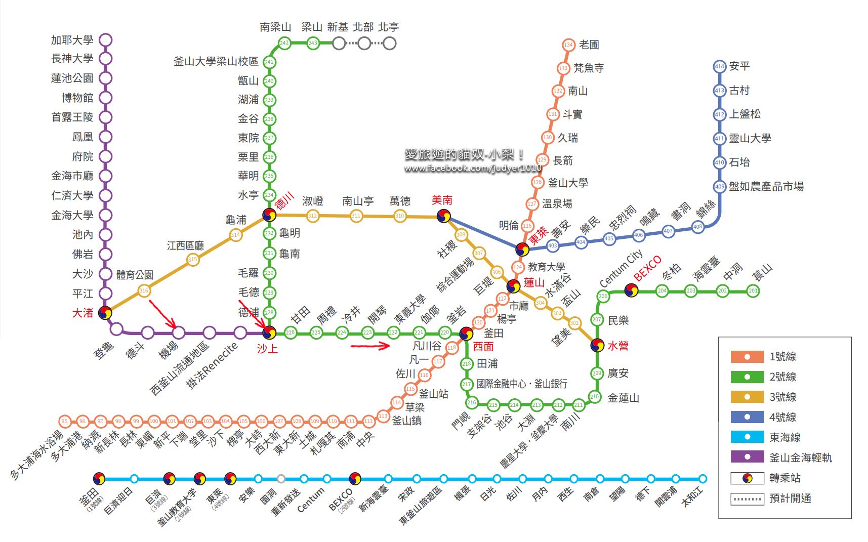 我們來看一下地鐵圖,紫色線就是釜山金海輕軌,可以從「504機場站」搭到「501沙上站(사상역)」,再轉搭地鐵2號線去你要去的地方,通常去釜山市區都是往「226甘田站(감전역)」方向,若是要搭去南浦站「111南浦站」就要去「西面站」轉1號線,若是要搭去「203海雲台站」就可以不用再轉車,整趟車程約1小時~