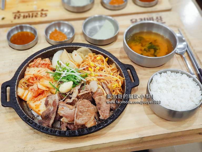 你們看看鐵盤裡被熱騰騰的烤肉、泡菜、洋蔥、豆芽塞得滿滿的,上面用蔥絲跟蒜頭點綴,旁邊還有大醬湯、沾醬和白飯,看了令人食指大動,這樣的份量讓我吃得好飽!