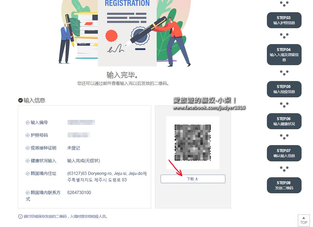 這裡勾"同意全部條款",然後"提交"即可~另外,再說一次:Q-CODE現在可以統一由同行的其中一人,代為輸入資訊申請,最多可以添加至20位~可在這一頁點"同伴添加"(跟著網站指示填寫即可,幾個人就會產生幾個QR CODE)