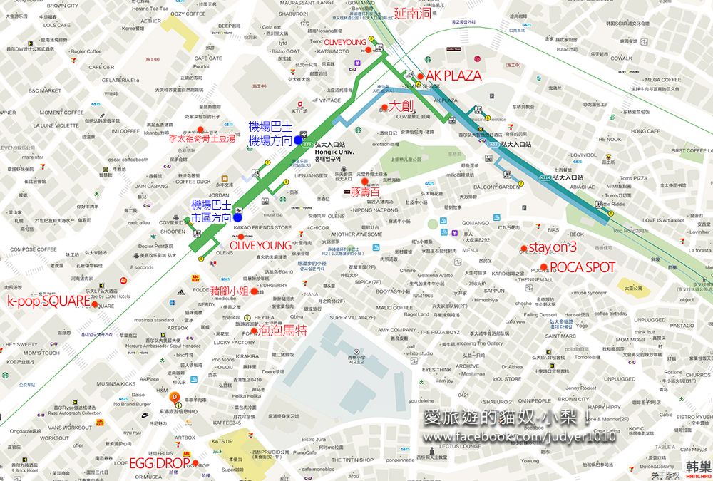stay on 3民宿的位置標示如下,附近有6002機場巴士(下車站名:弘大入口站),無論去程、回程都可搭機場巴士很方便~另外,往返機場也可以搭乘機場鐵路快線的一般列車到弘大站,住這裡可以從7號出口搭電扶梯上去,不用爬樓梯,超級輕鬆~