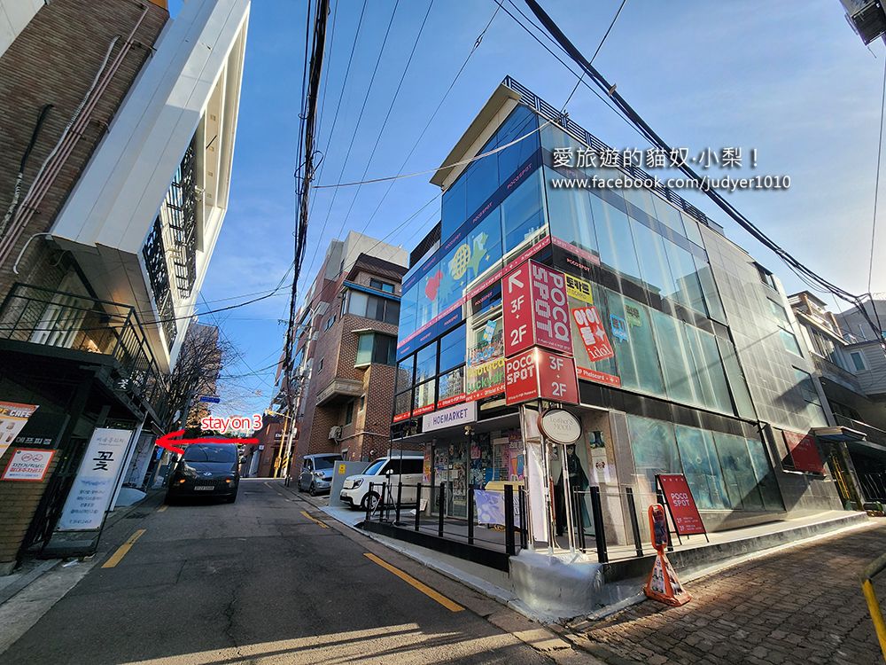 弘大住宿 \ stay on 3民宿,位於弘大站7號出口附近,6人房有2間衛浴,對面有POCA SPOT(K-pop 小卡專賣店),交通便利~