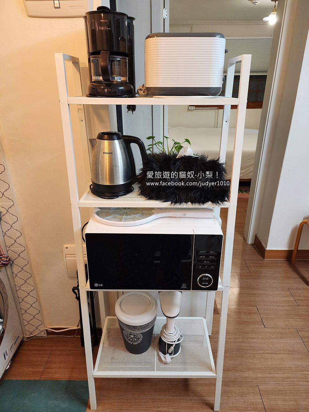 這是廚房,有冰箱、飲水機、快煮壺、微波爐、烤麵包機、洗衣機…等等