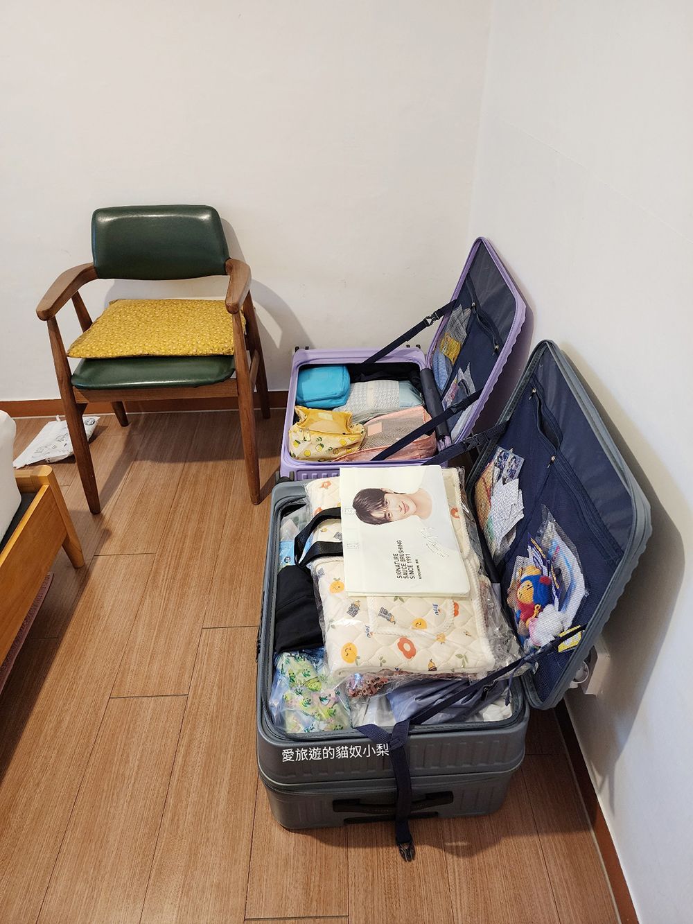 真心的必須要再次讚嘆我的行李箱們!你們看看,在這麼小的房間裡面,可以用前開式打開2個29吋的河馬箱(點我看介紹),如下圖,給你們比對一下空間,完全非常OK~~~讚讚讚啦!